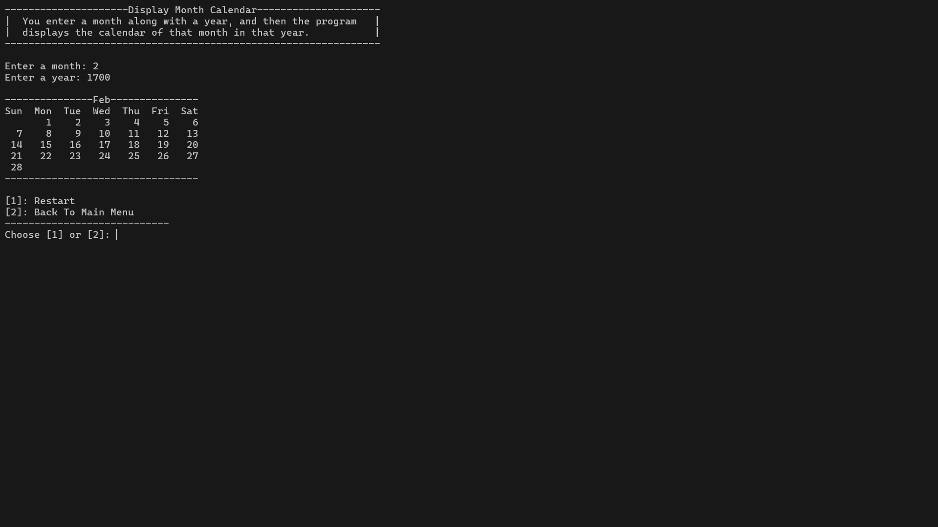 - Monthly and Yearly Calendars: Display formatted calendars directly in the console.