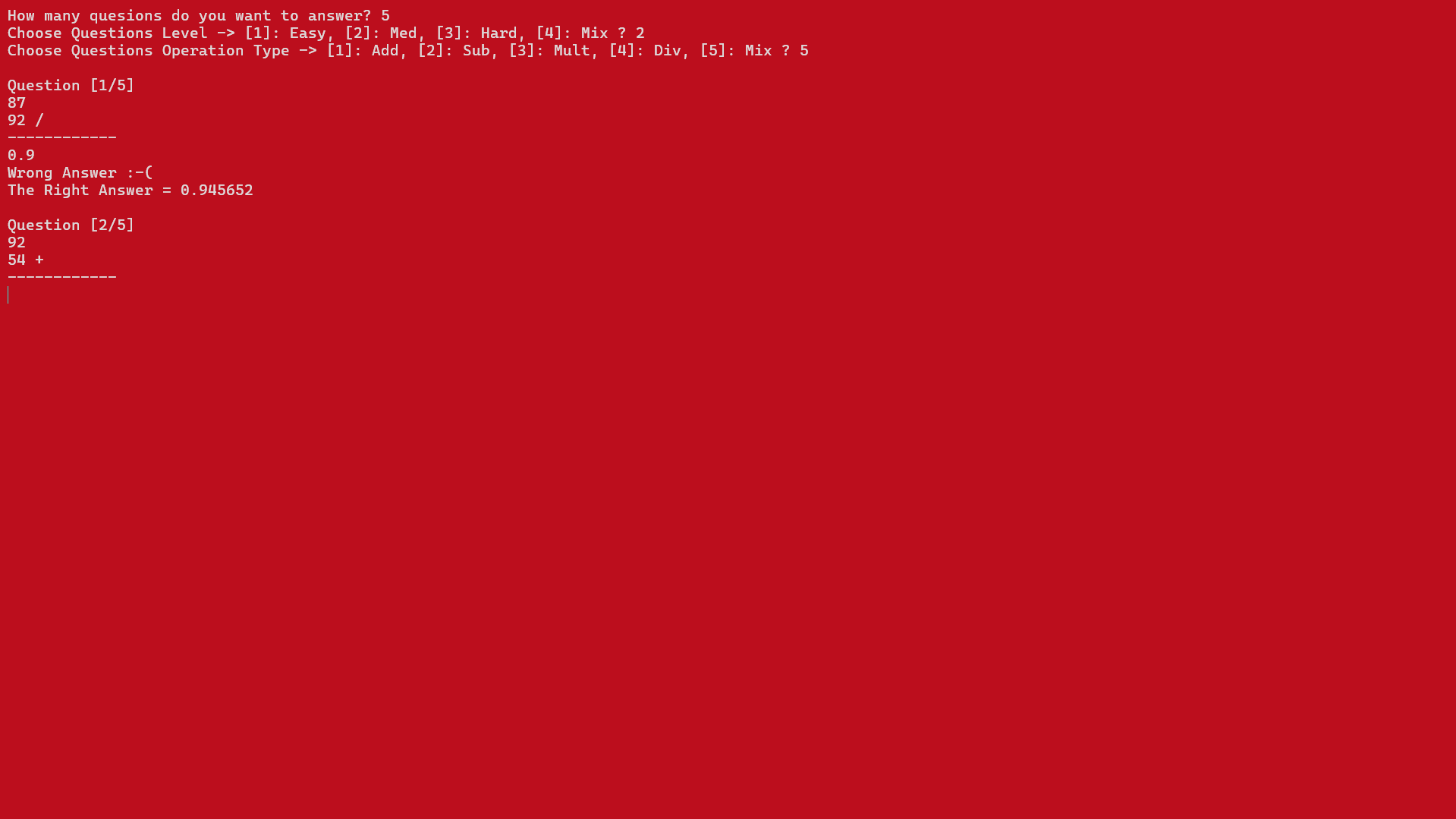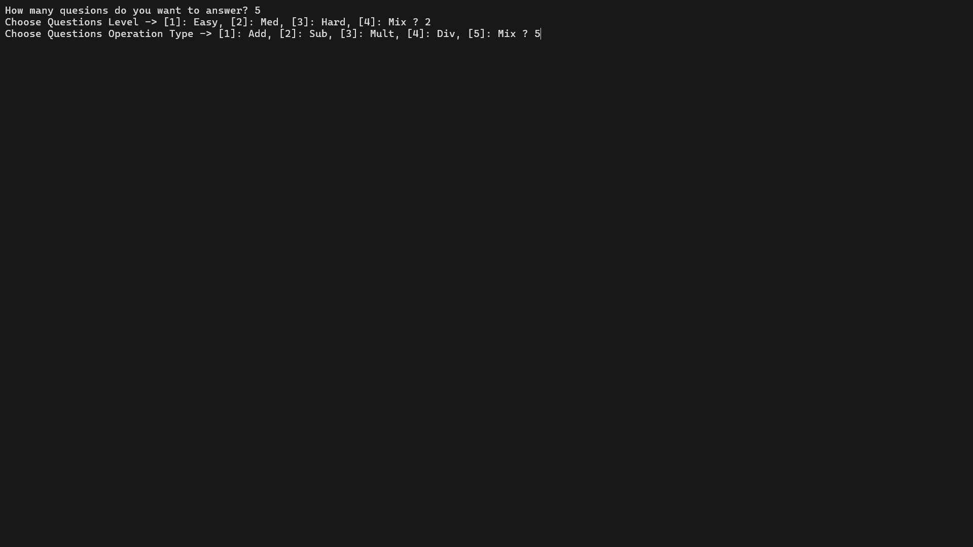 A compact, single-file C++ console application that generates and grades an arithmetic quiz. The user chooses the number of questions (1–100), the difficulty level (Easy / Medium / Hard / Mixed), and the operation type (Addition, Subtraction, Multiplication, Division, or Mixed). The quiz auto-generates random questions, accepts answers, gives immediate feedback (right/wrong with visual and audible cues), and shows a final score with pass/fail status. Clean, focused, and ideal for demonstrating solid C++ fundamentals and user-facing CLI polish.
