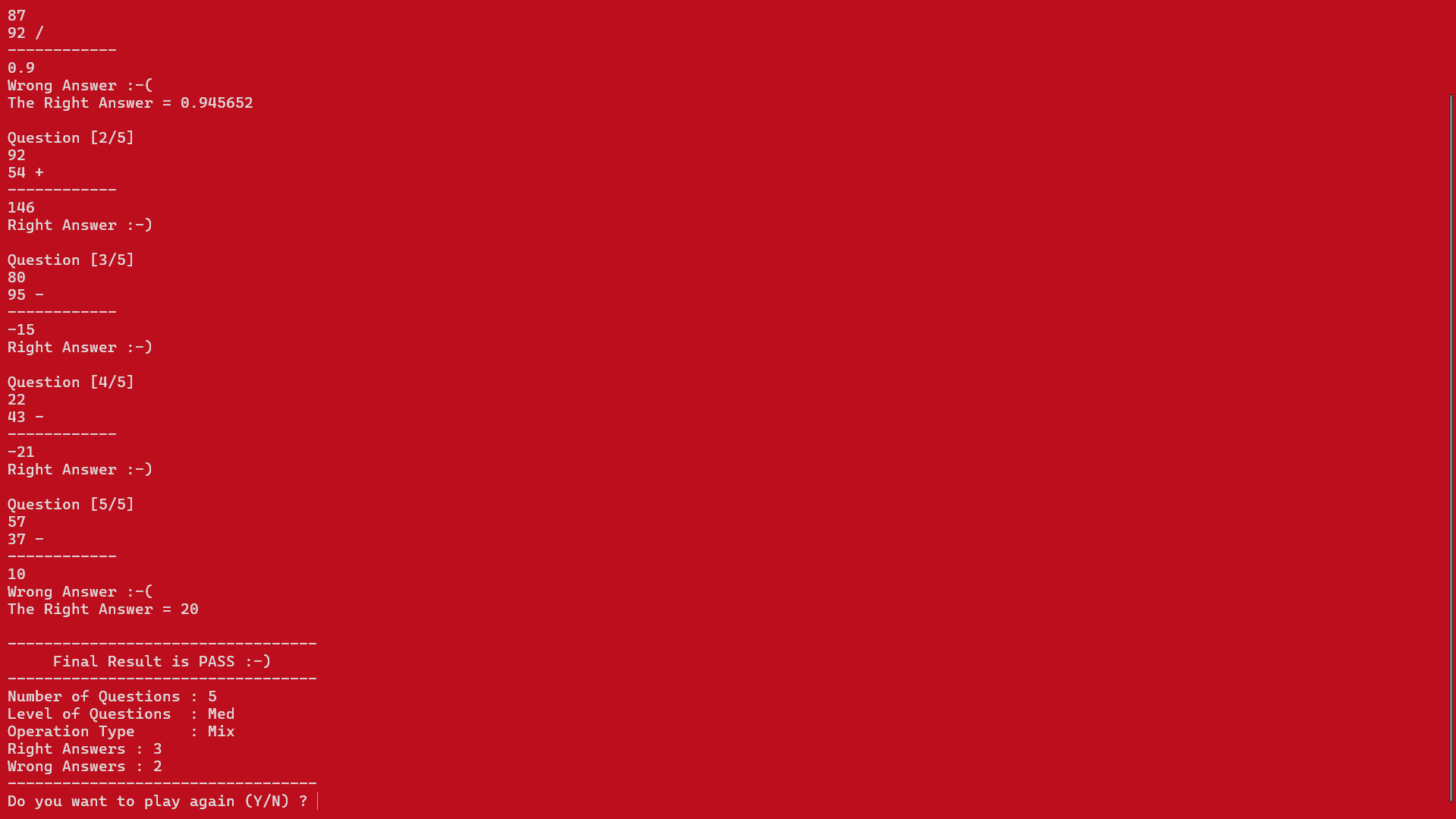 The program stores each question’s operands, operation, correct answer, user answer, and whether it was answered correctly.